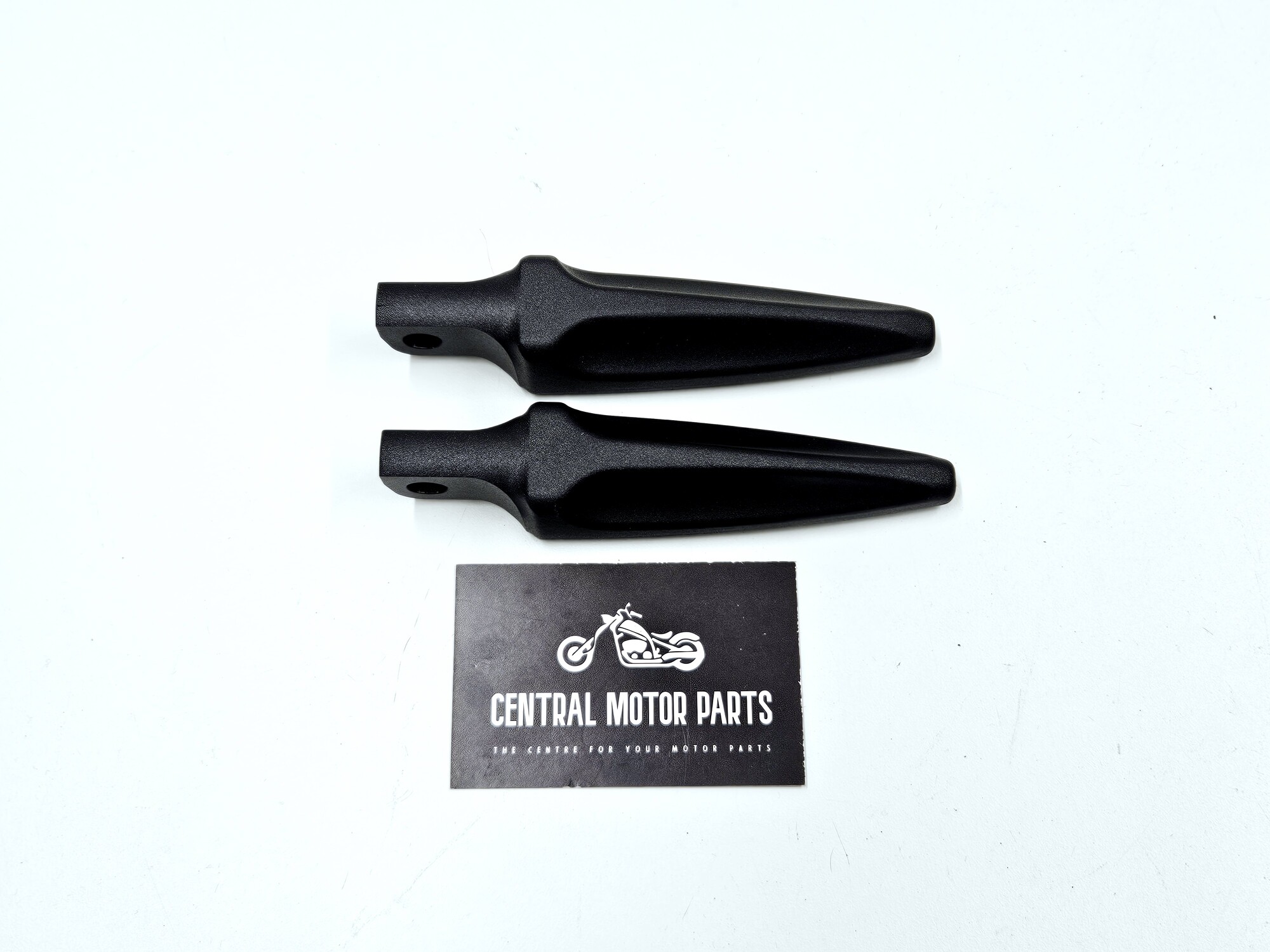 Een set mat zwarte voet pegs voor Harley Davidson modellen met 45 graden aansluiting voor de voetpegs.