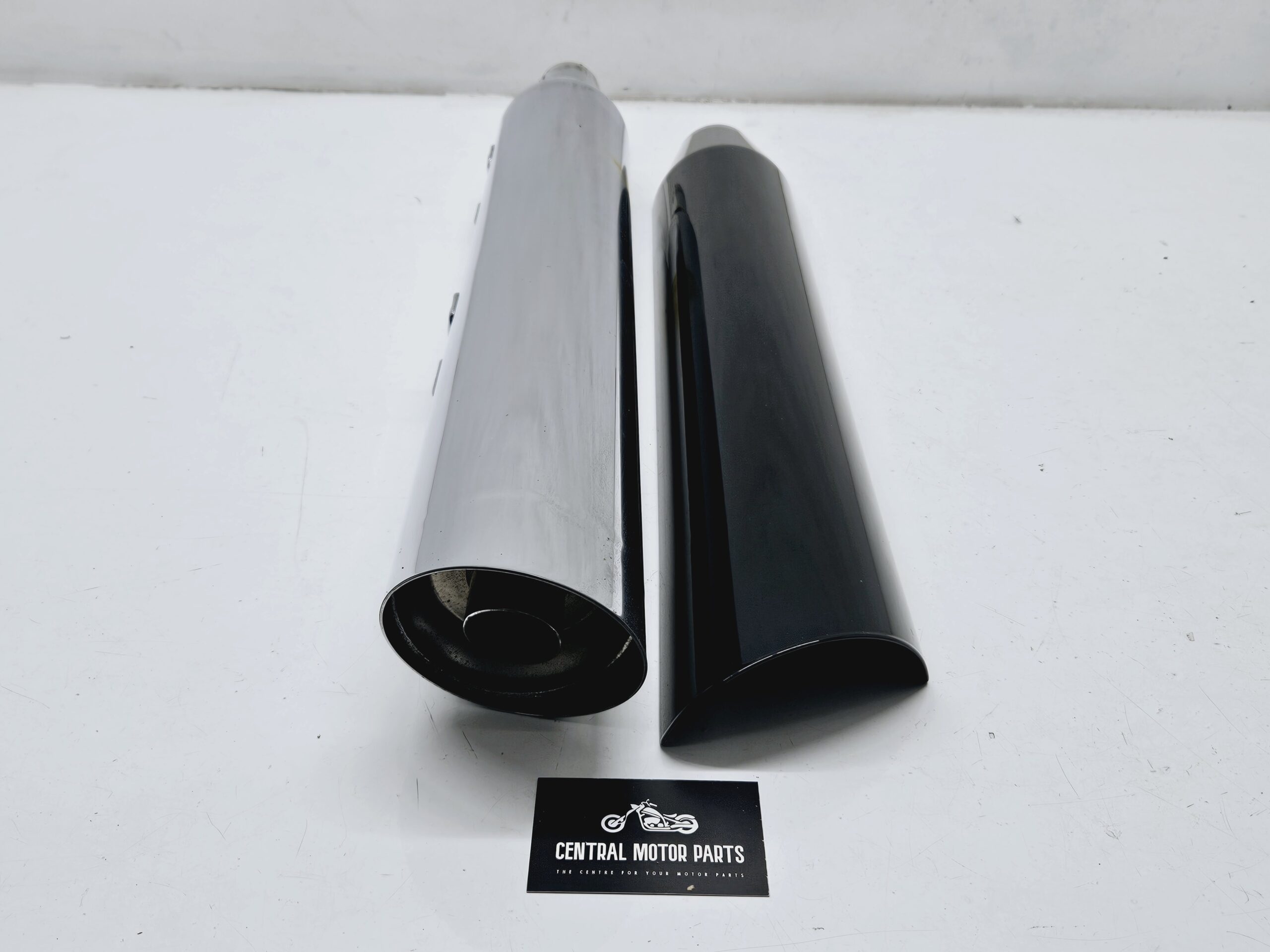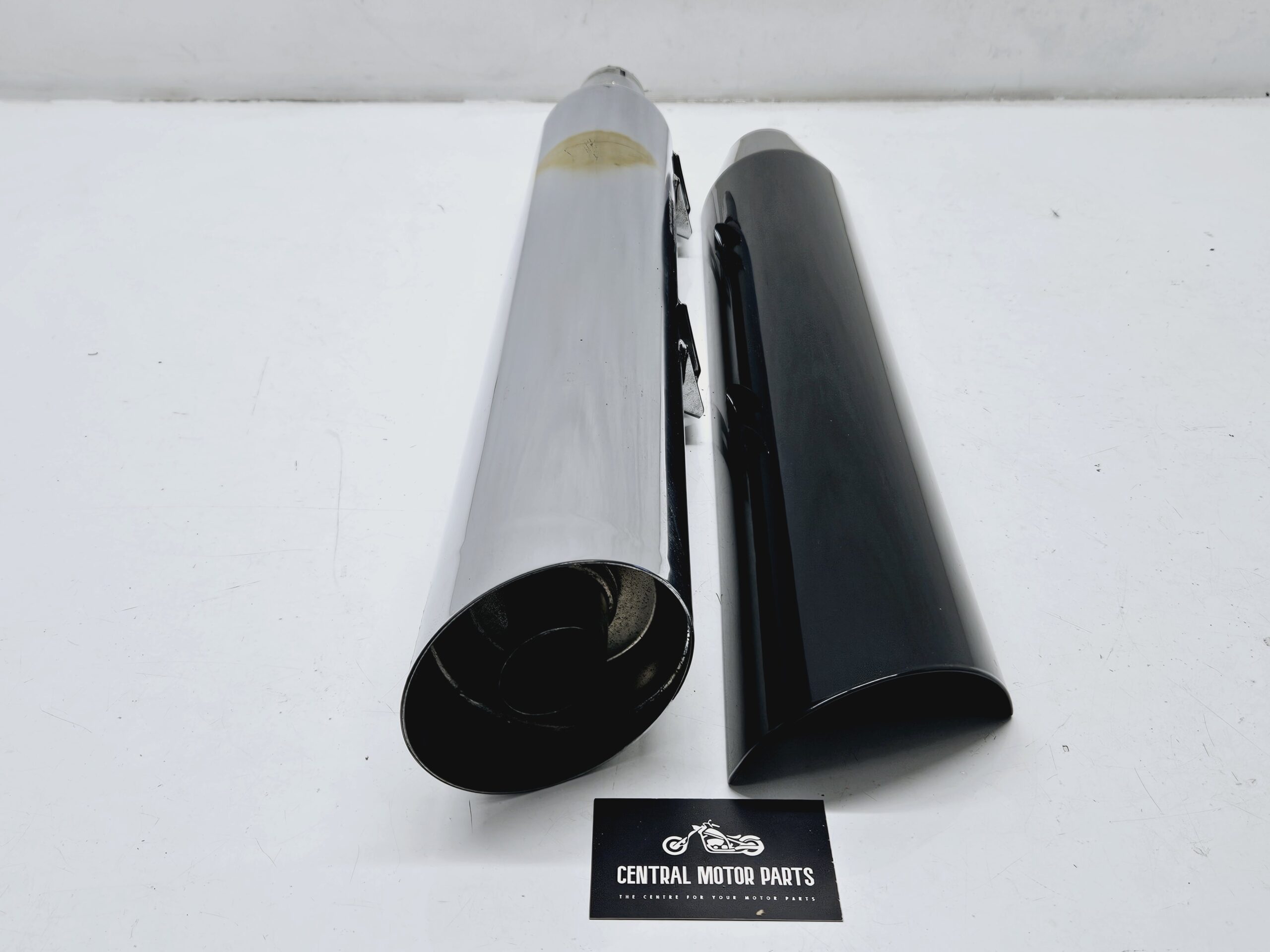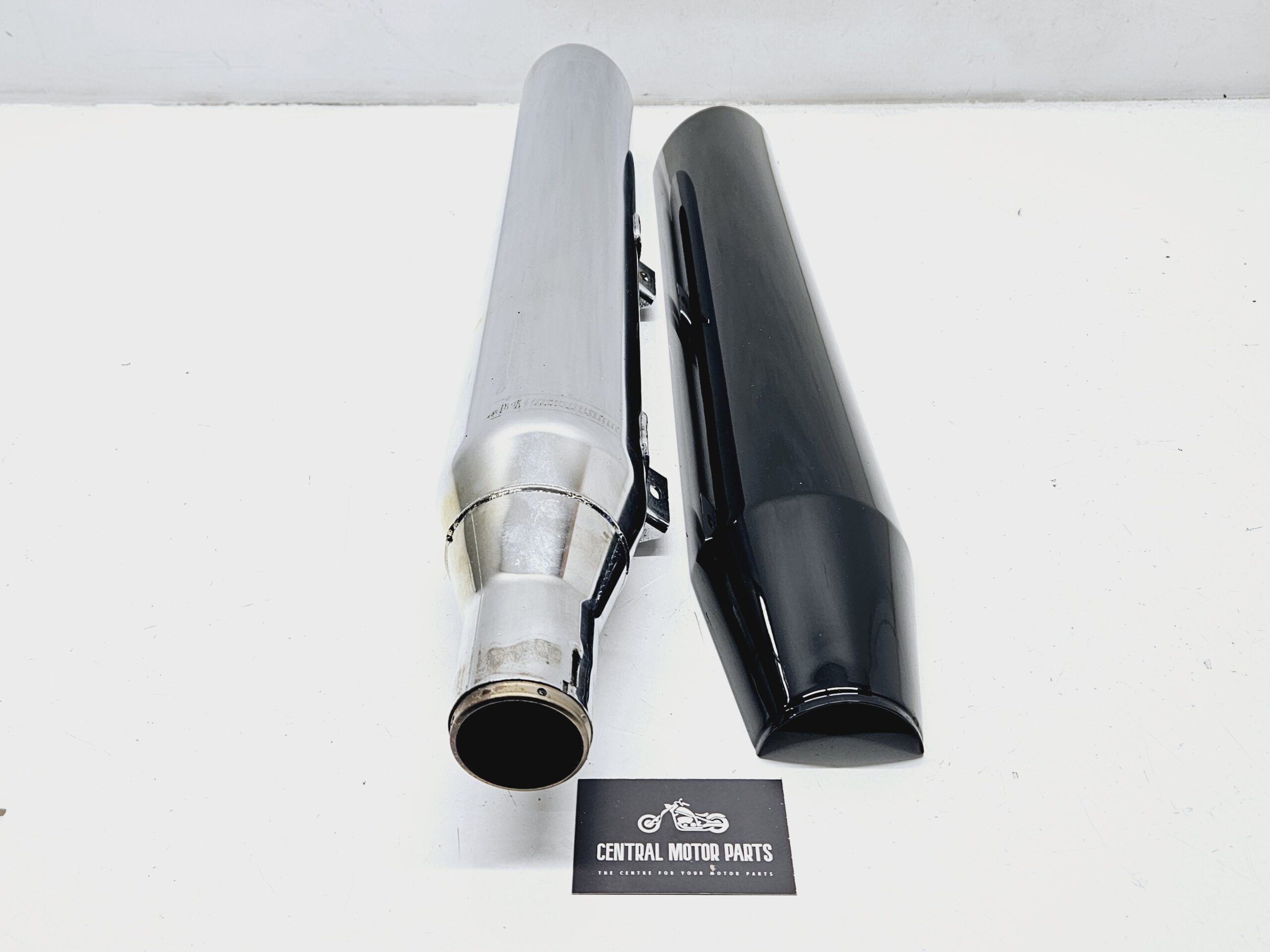 Een chromen demper met zwart hitteschild voor Harley Davidson Softail Sport Glide modellen van 2018 t/m nu