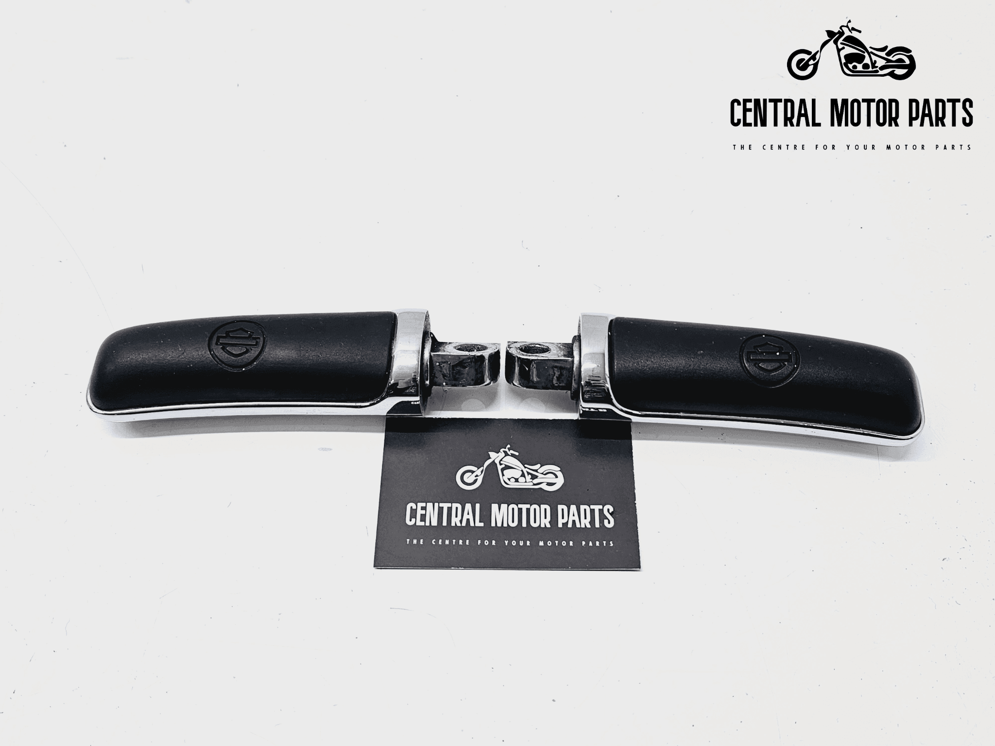 Een set chromen Rider foot pegs met rubberen grip voor velen Harley Davidson modellen.
