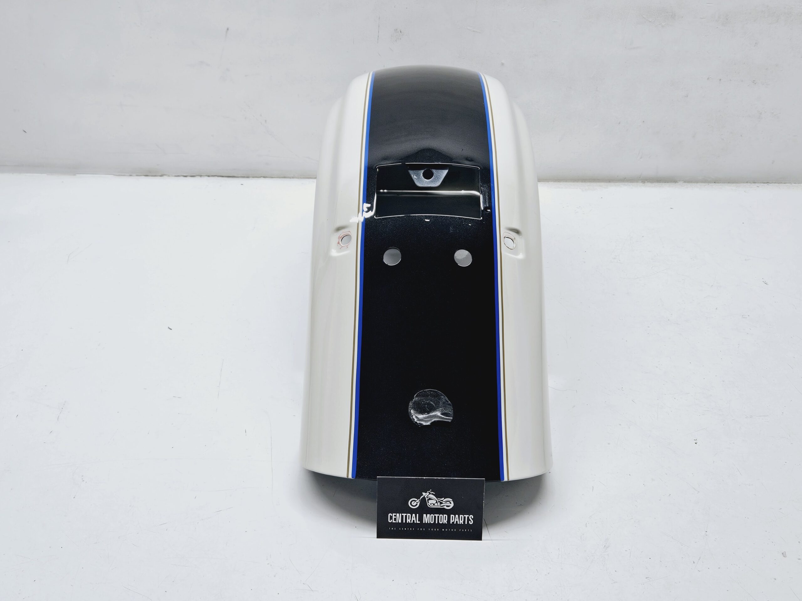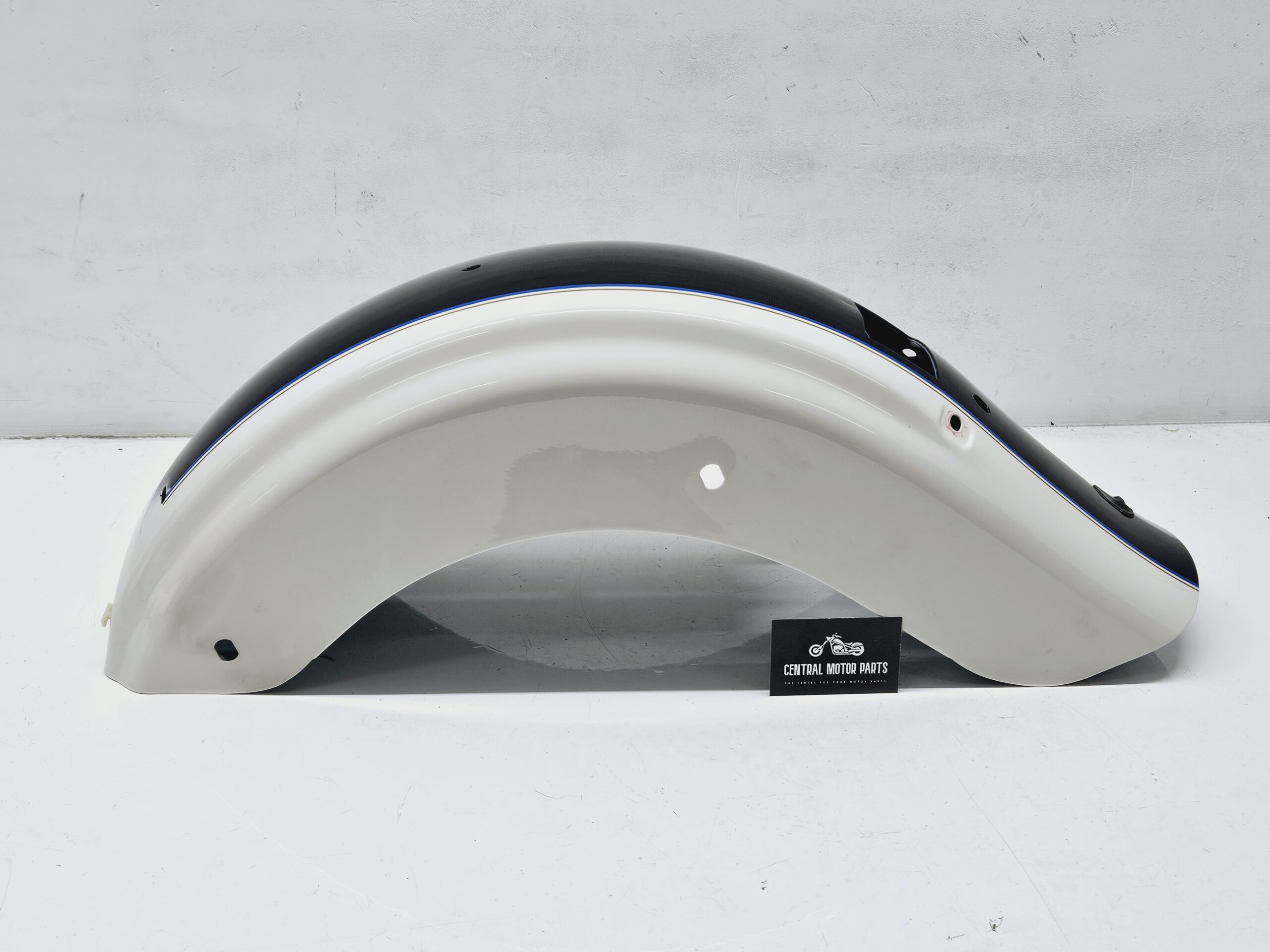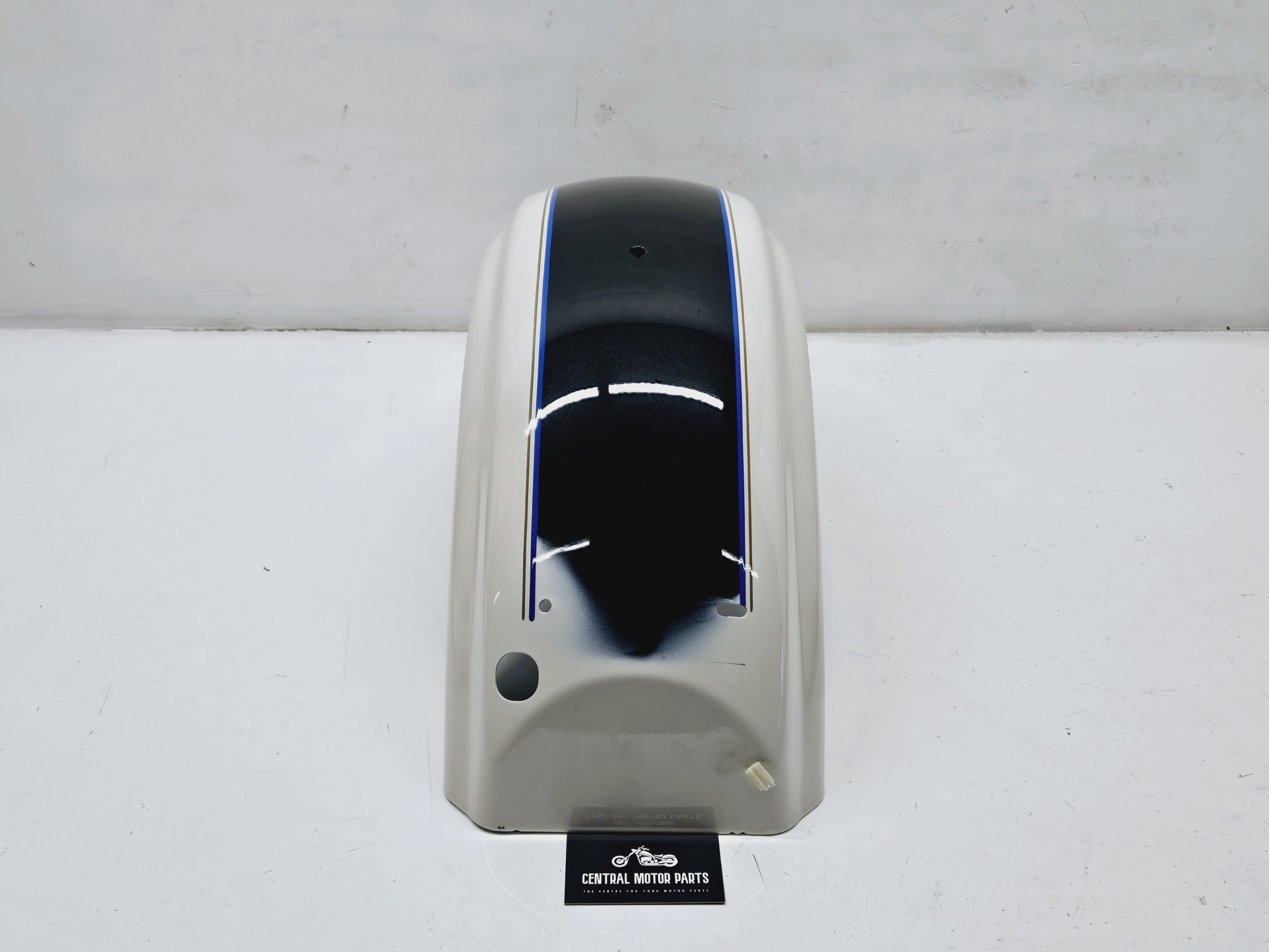 Een achter spatbord in de kleuren Birch White & Midnight Blue with blue and tan stripes voor Harley Davidson Touring modellen van 2009 t/m 2023.